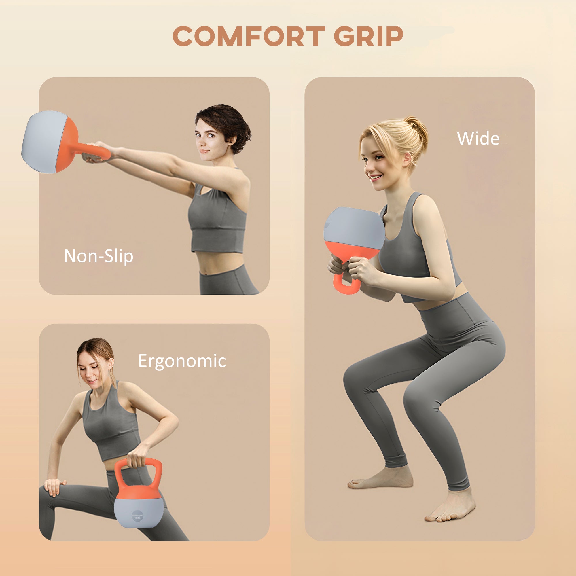• Wide, ergonomic and non-slip handle, giving you complete control when handling the kettlebell