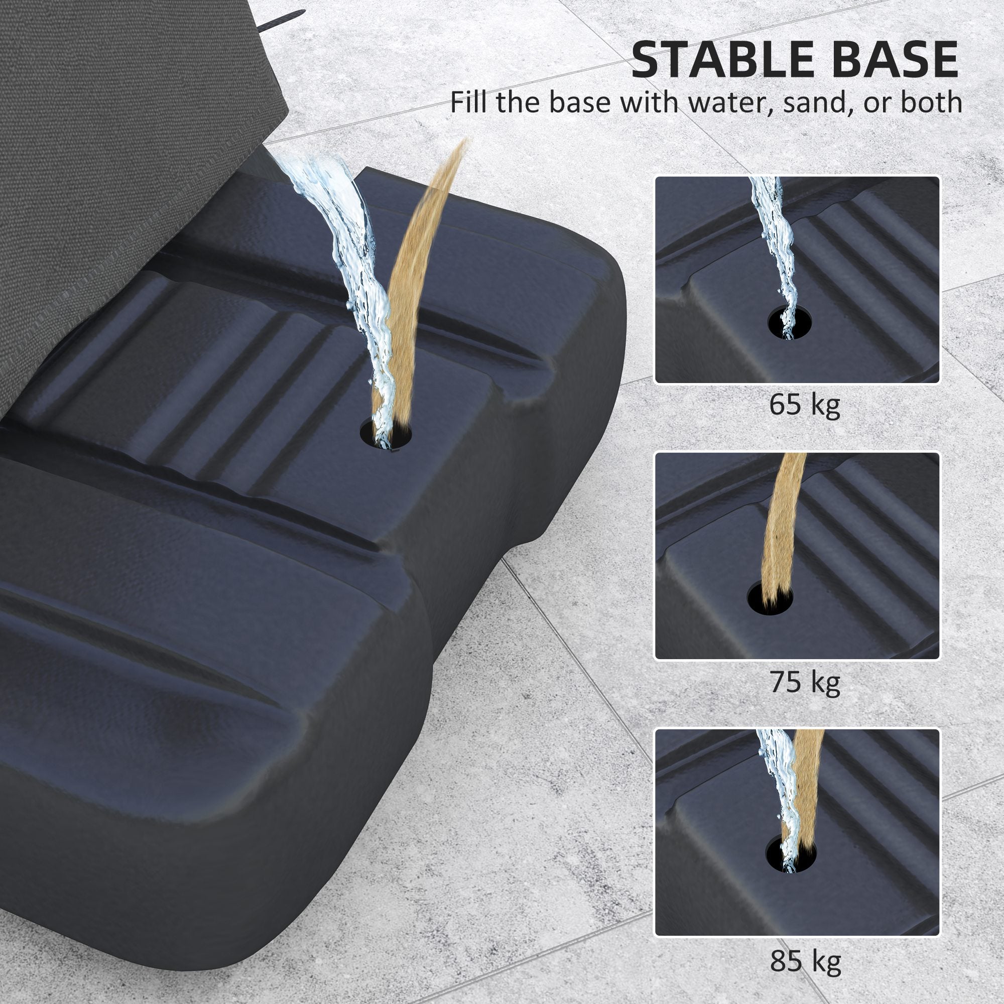 • Fill the base with 65kg of water, 75kg of sand or 85kg of water and sand