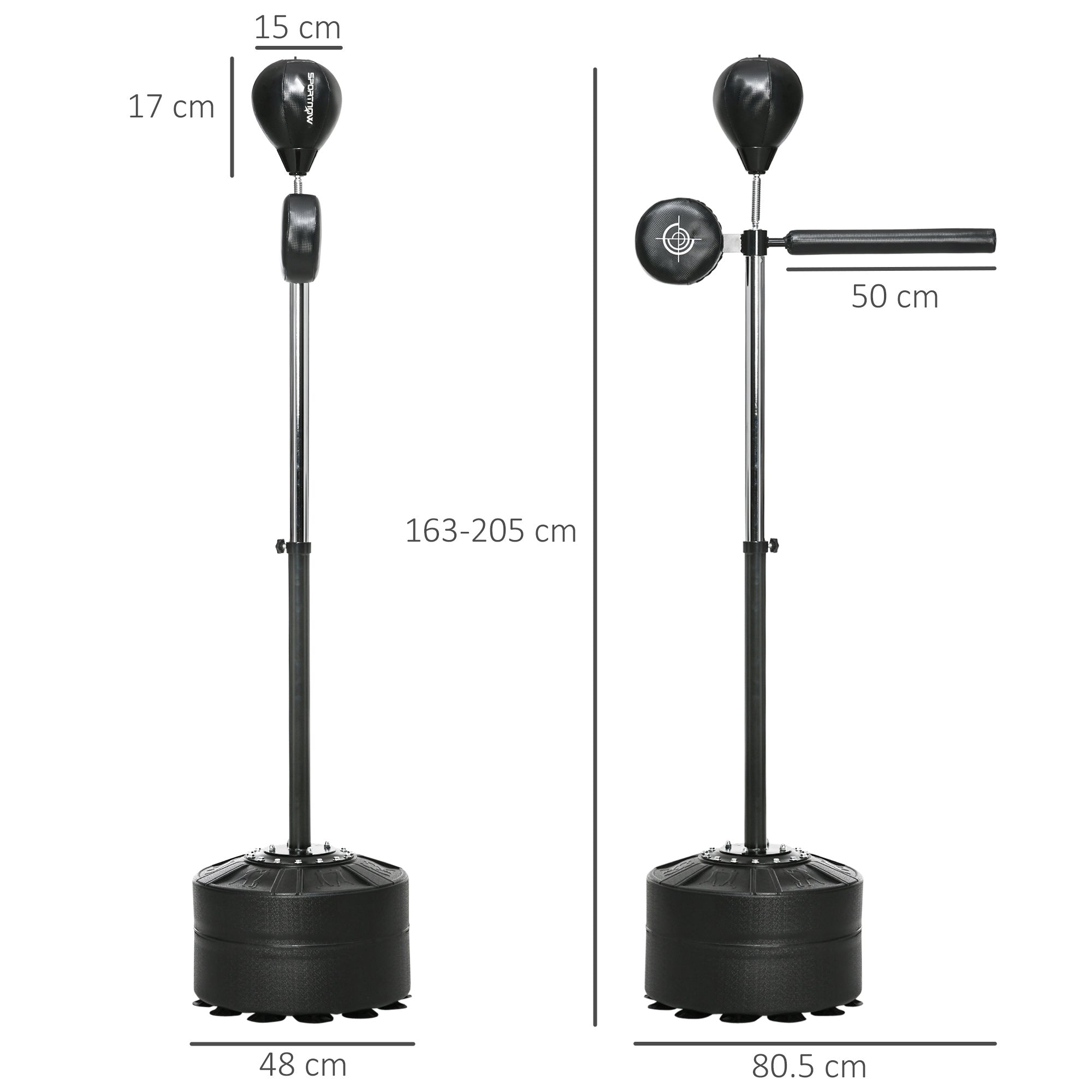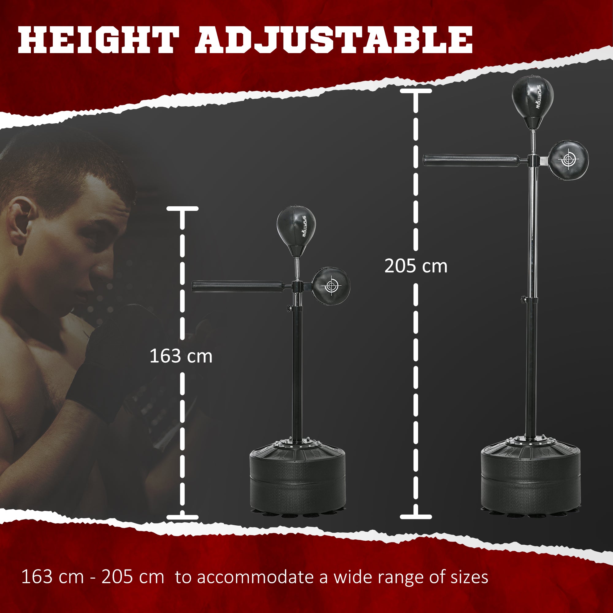 Boxing isn't just about how hard you punch; it's timing, reflex and accuracy. You can now sharpen all your skills, thanks to this SPORTNOW boxing speed bag. Designed to emulate real sparring, it has a reflex bar that rotates on impact, letting you dodge, react and hit back. It's freestanding – the base can be weighed down with sand or water for stability. Hand wraps protect your fists, allowing you to push your limit, so you can improve your ability and become your best possible version.