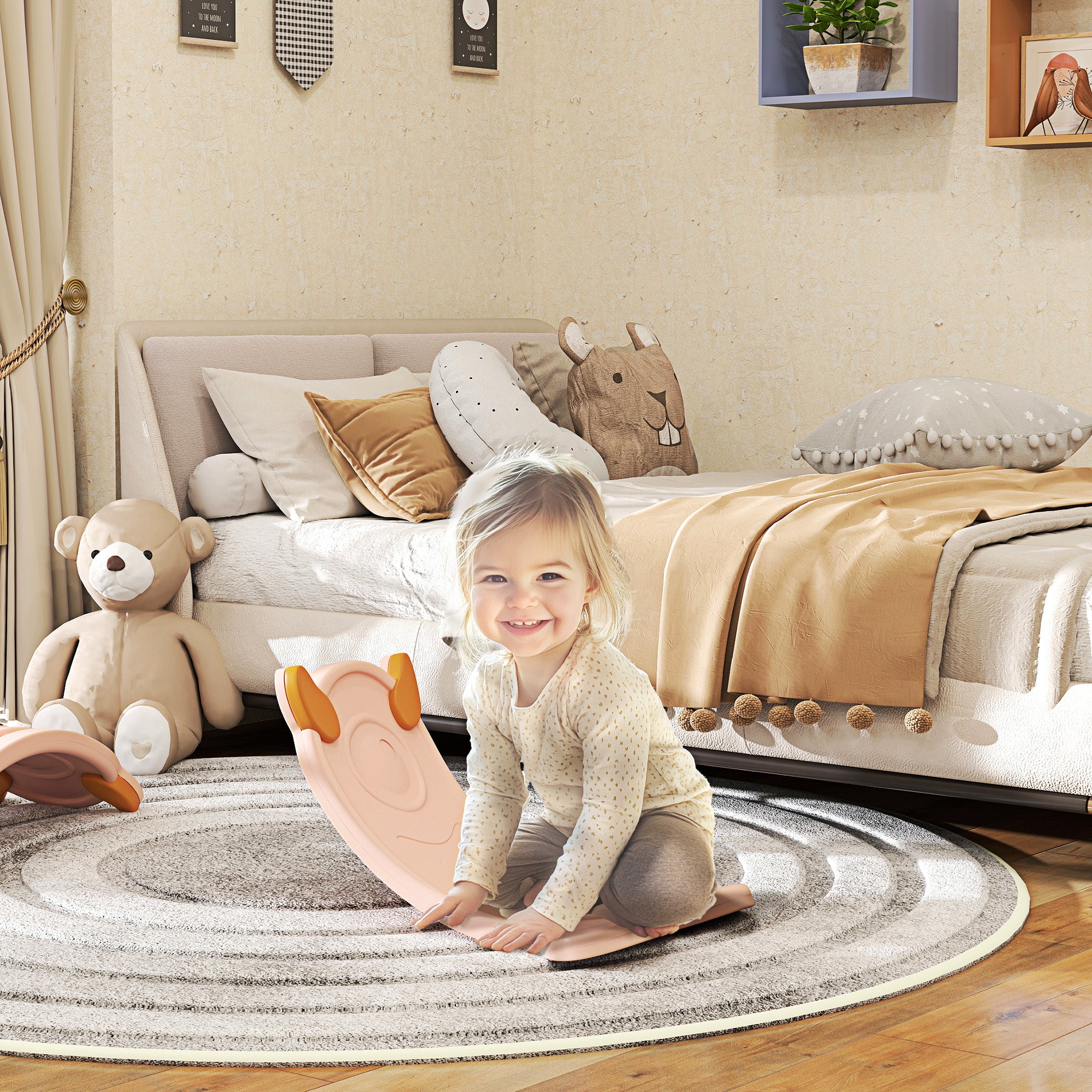 A simple yet effective way to eliminate child boredom – the AIYAPLAY kids balance board. They can use it standing up and try to maintain their balance, just like surfing. They can also sit and rock the board. It's a great way to enhance coordination and balance, suitable for toddlers and older children alike. Made with tough pinewood multilayer board, it's firm, safe and stable, creating a cool space to enhance playtime activities.