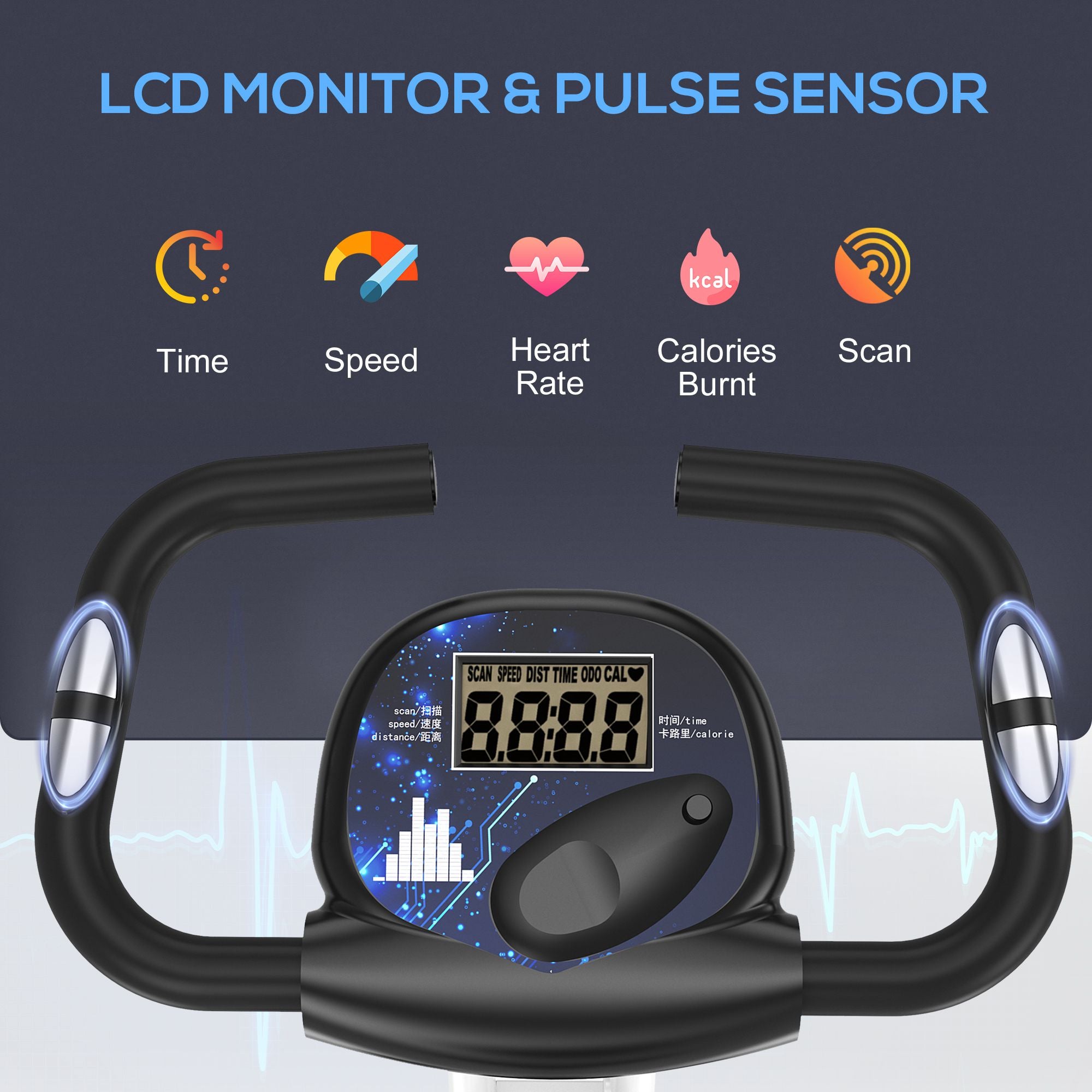 This magnetic exercise bike from HOMCOM. Adjustable to eight different resistance levels to suit you, it is fitted with a five-level adjustable seat. Suitable height from 155-180 cm. An LCD monitor is placed on the front of the cycling machine, which displays time elapsed, speed, distance, calories and heart rate (measured by the metal panels on the handlebar). An 'X' shaped metal frame for strength and stability of the indoor exercise bike, it can be folded for easy storage when not needed.