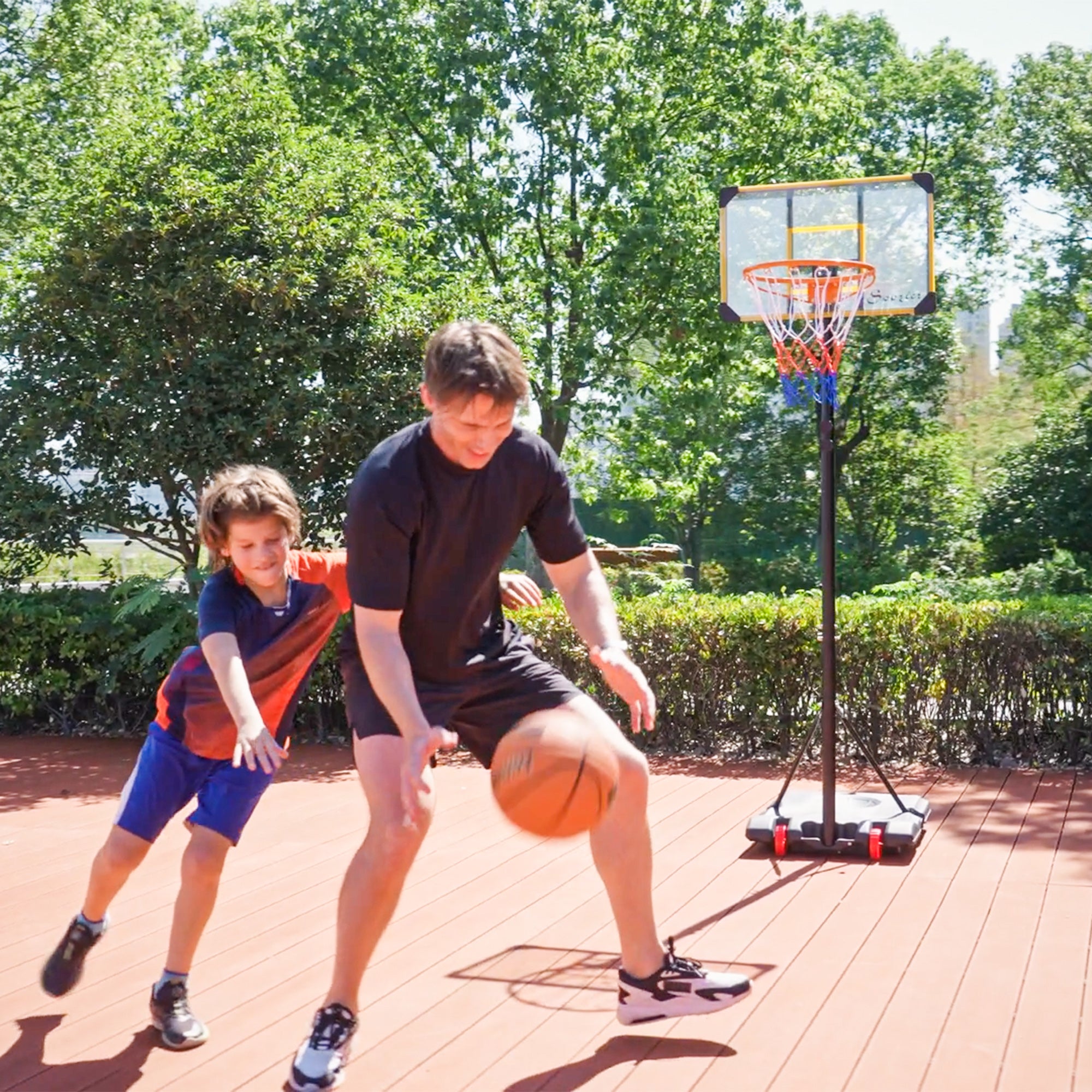 Enjoy shooting hoops with this SPORTNOW Basketball hoop and stand. It has an adjustable height, making it suitable for all ages – everyone can join the fun. A steel frame for strength and durability, whilst the base can be filled with water or sand, keeping it firmly in place. Wheels at the bottom let you move the stand easily. Play on your own or with others; either way, you'll enjoy the swooshing sound of the ball passing through the net.