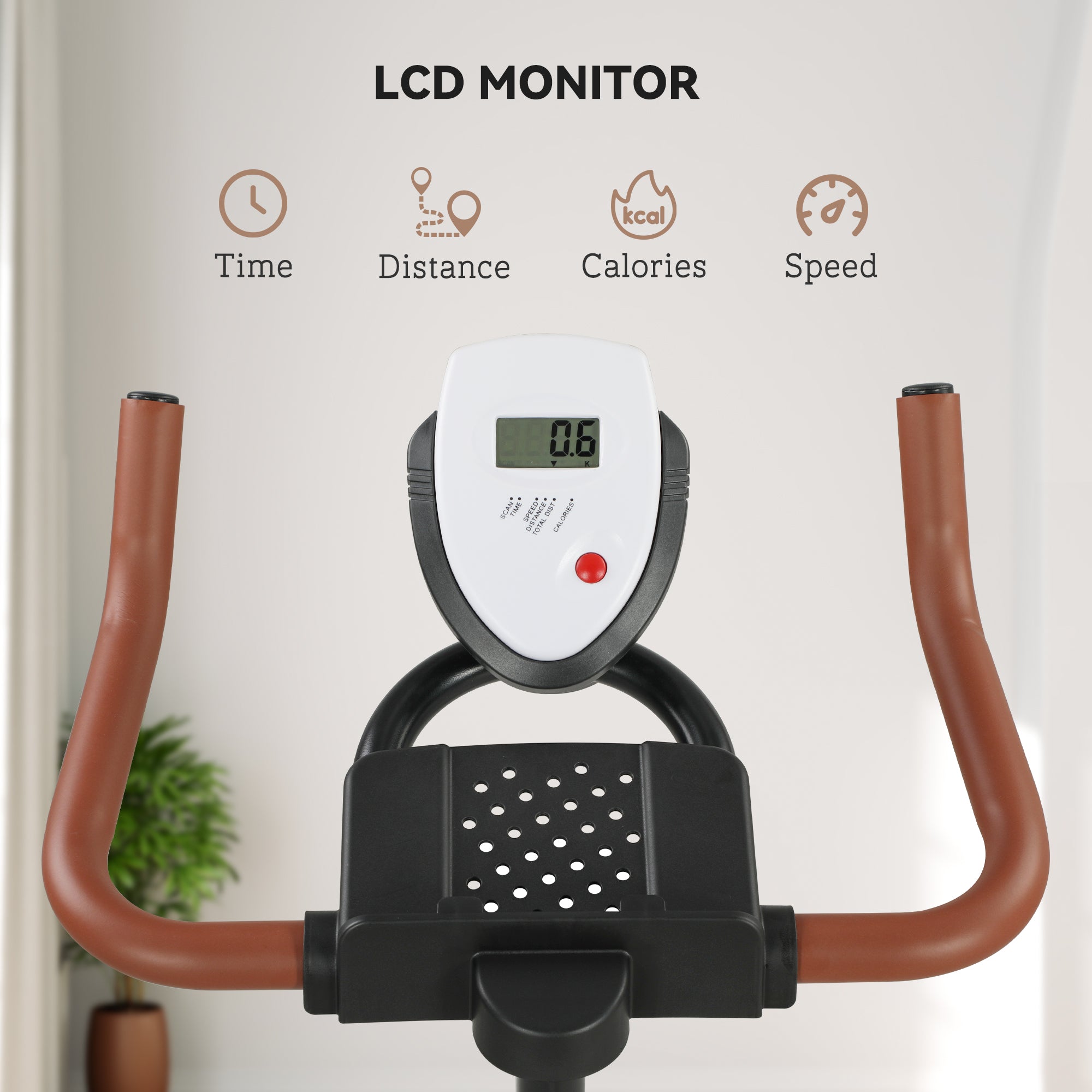 Achieve your fitness goals at home with the SPORTNOW static bike. Adjust the resistance to your comfort level – and increase it as you get stronger for a more intense workout. The seat and handlebar can also be adjusted to fit different heights, ensuring comfort. The LCD display shows time, distance and calories, helping you track your progress. Great for any home gym, its stylish design fits right in, while the built-in wheels make it easy to move wherever you want.