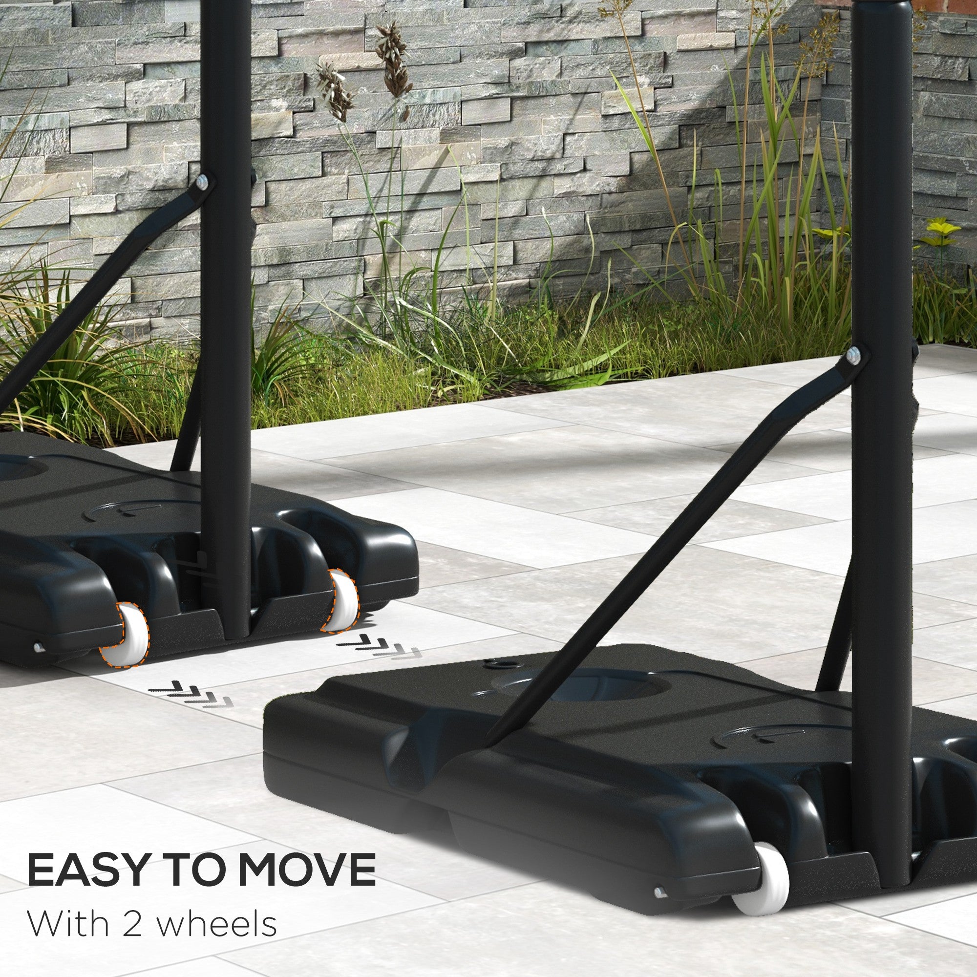 Elevate your game with the SPORTNOW basketball hoop stand, featuring a six-level adjustable height system – suitable for all ages and skill levels. Fill the base with sand or water for stability, keeping the stand firm and upright when playing. Its shatter-resistant backboard and shock-absorbing springs allow for heavy usage without it wearing. Built-in wheels for simple movement, you'll set it up anywhere for an enjoyable game of basketball.